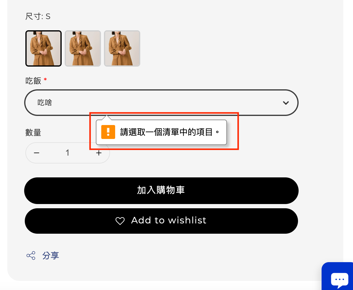 - 商品頁面若有必填選項,顧客就無法點擊「加入購物車」或是「立即購買」按鈕,並會顯示需要執行的動作