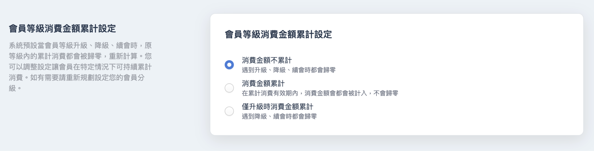 - 僅升級時消費金額累計:遇到降級、續會時都會歸零