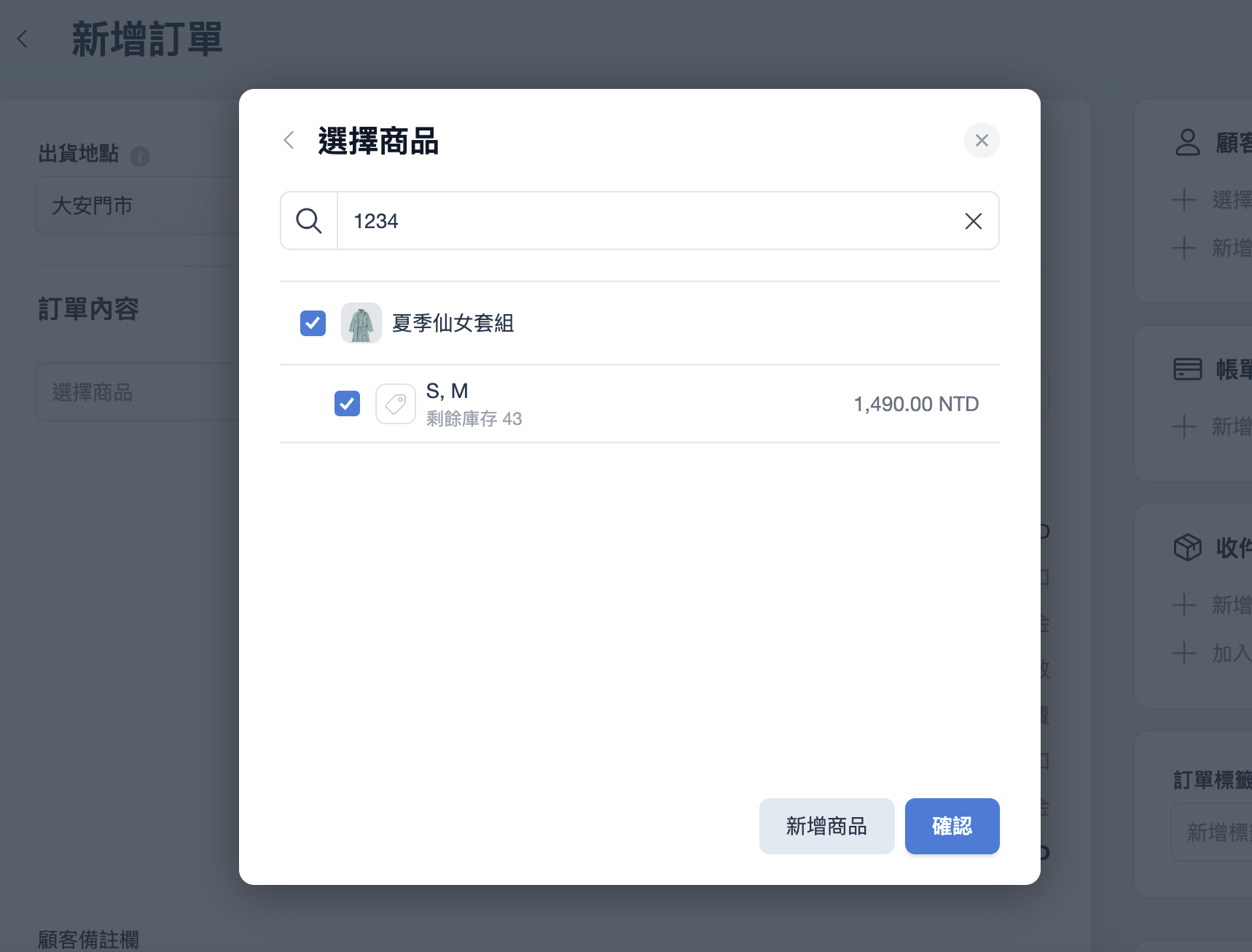 現在手動新增訂單時,選擇商品只需直接輸入商品編號(SKU)或條碼,即可快速定位對應規格,不再需要逐一從所有規格中尋找,大幅提升商家營運效率。