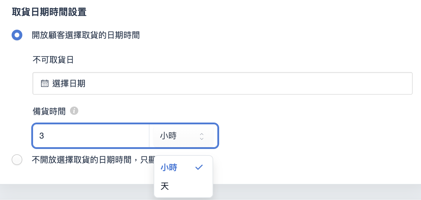 現在,若顧客線上下單並選擇至實體取貨,商家可將備貨時間單位由原本的「天」調整為「小時」。讓顧客取貨更彈性、更快速,商家也能更靈活安排備貨,提高出貨效率。