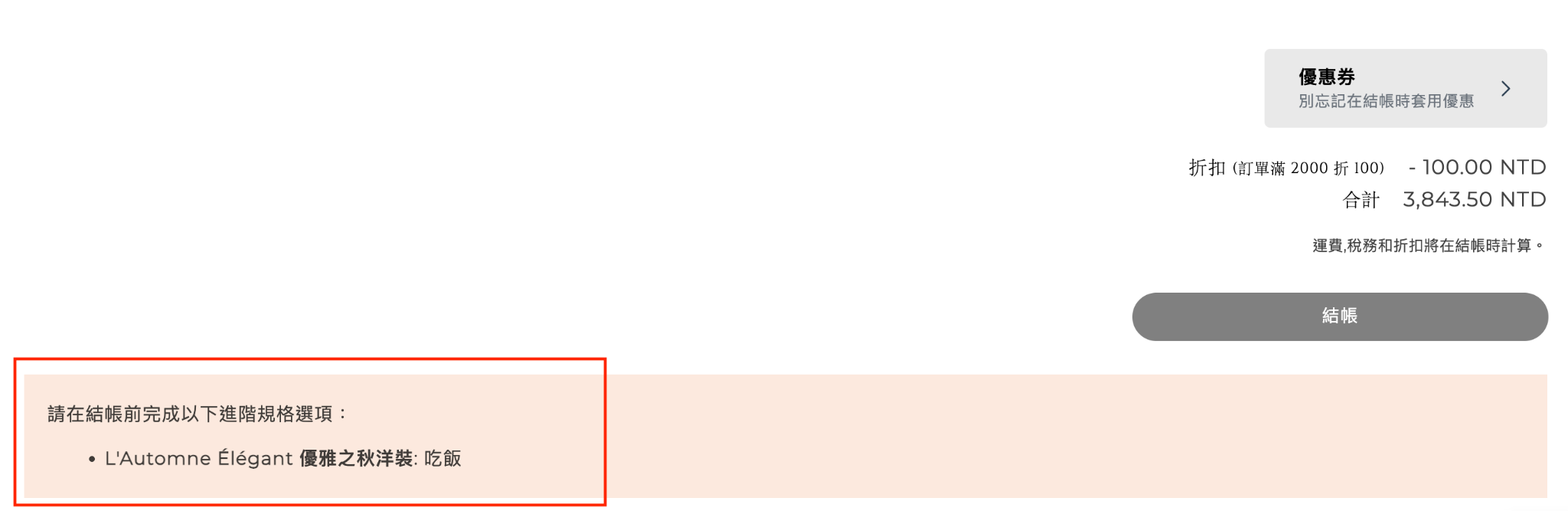 - 購物車內的商品若是有必填選項,但未填寫,顧客就無法點擊「結帳」按鈕,並會顯示需要執行的動作