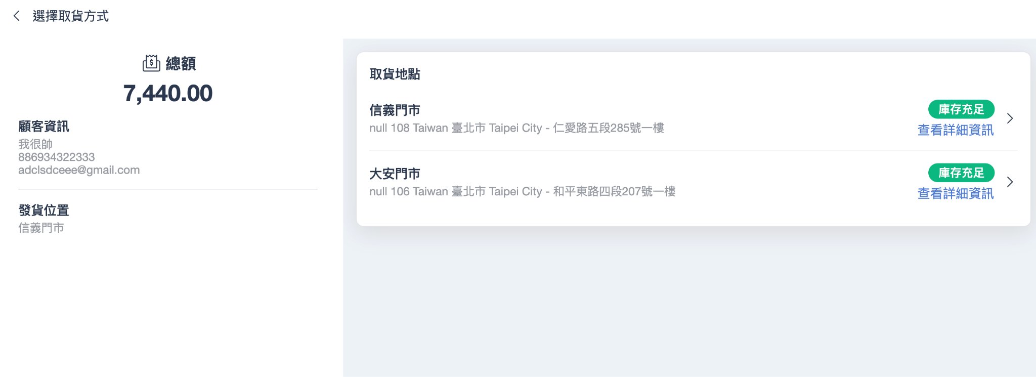 實體店人員在安排顧客至其他店面取貨時,現在可於「安排取貨」介面直接查看各店面庫存,快速確認存貨是否充足。減少門市間聯繫與顧客等待時間,讓取貨流程更順暢、體驗更貼心,也讓顧客感受到品牌的效率與用心。