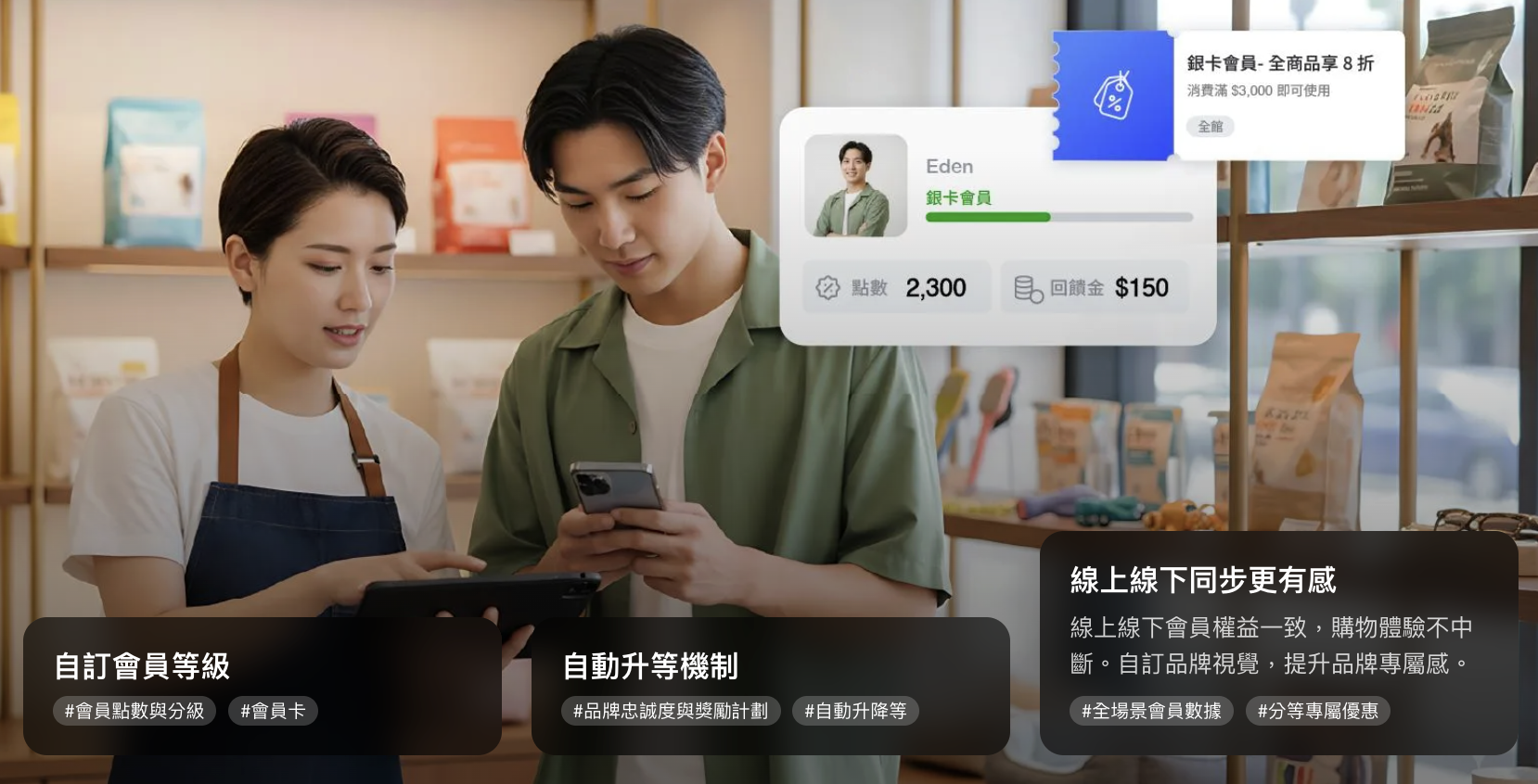 阿發問:「那種只來一次的過路客怎麼辦?」 Dawn 的做法是:讓優惠「跟著人走」。 透過 EasyStore 全場景會員系統,客人在門市消費累積的點數,回家後在官網也能折抵;網路上領的優惠券,門市也能用。