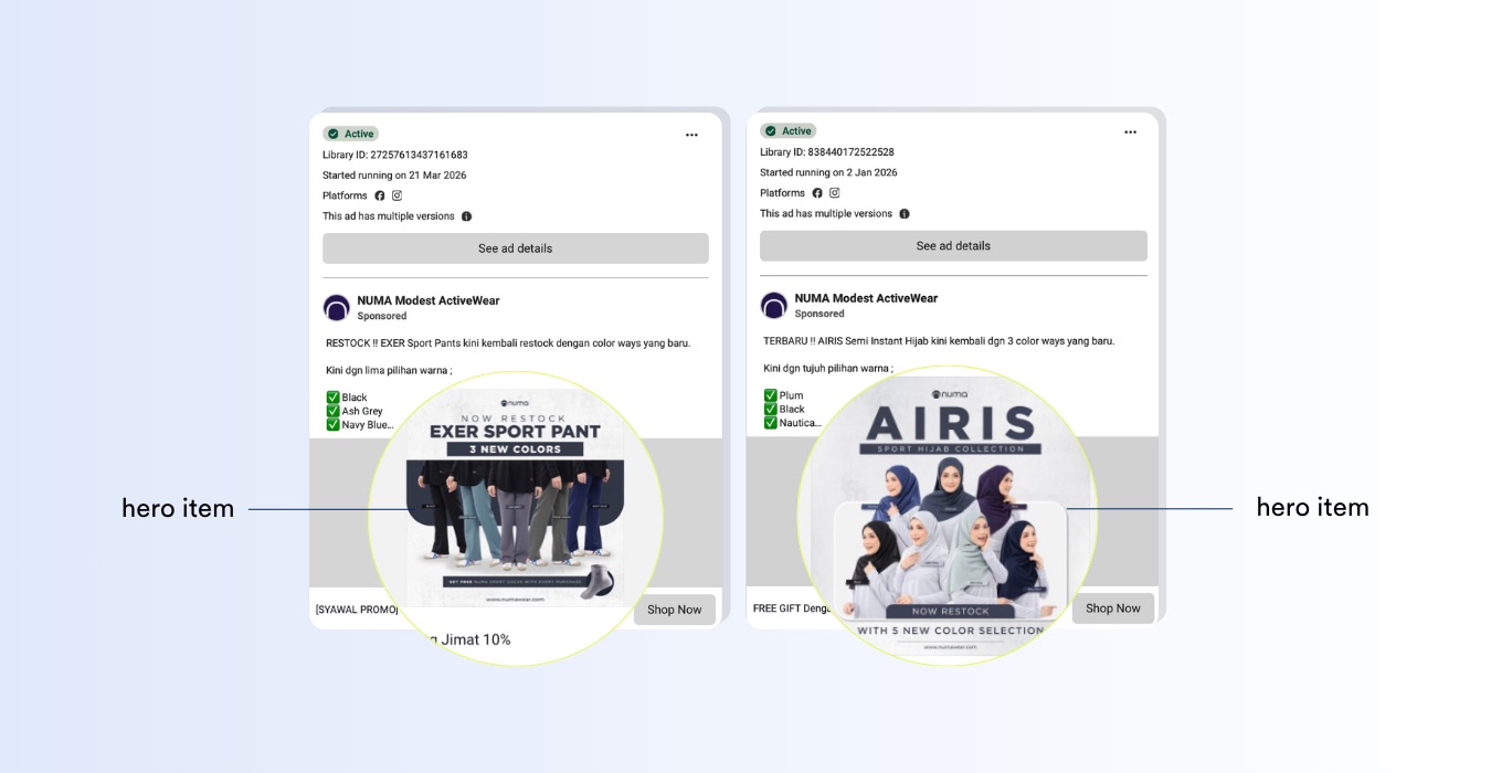 Rather than distributing effort thinly across a wide catalogue, the brand doubles down on what already works — the hero products customers return for, season after season. These pieces anchor NUMA’s Meta campaigns and carry consistent weight across every channel.