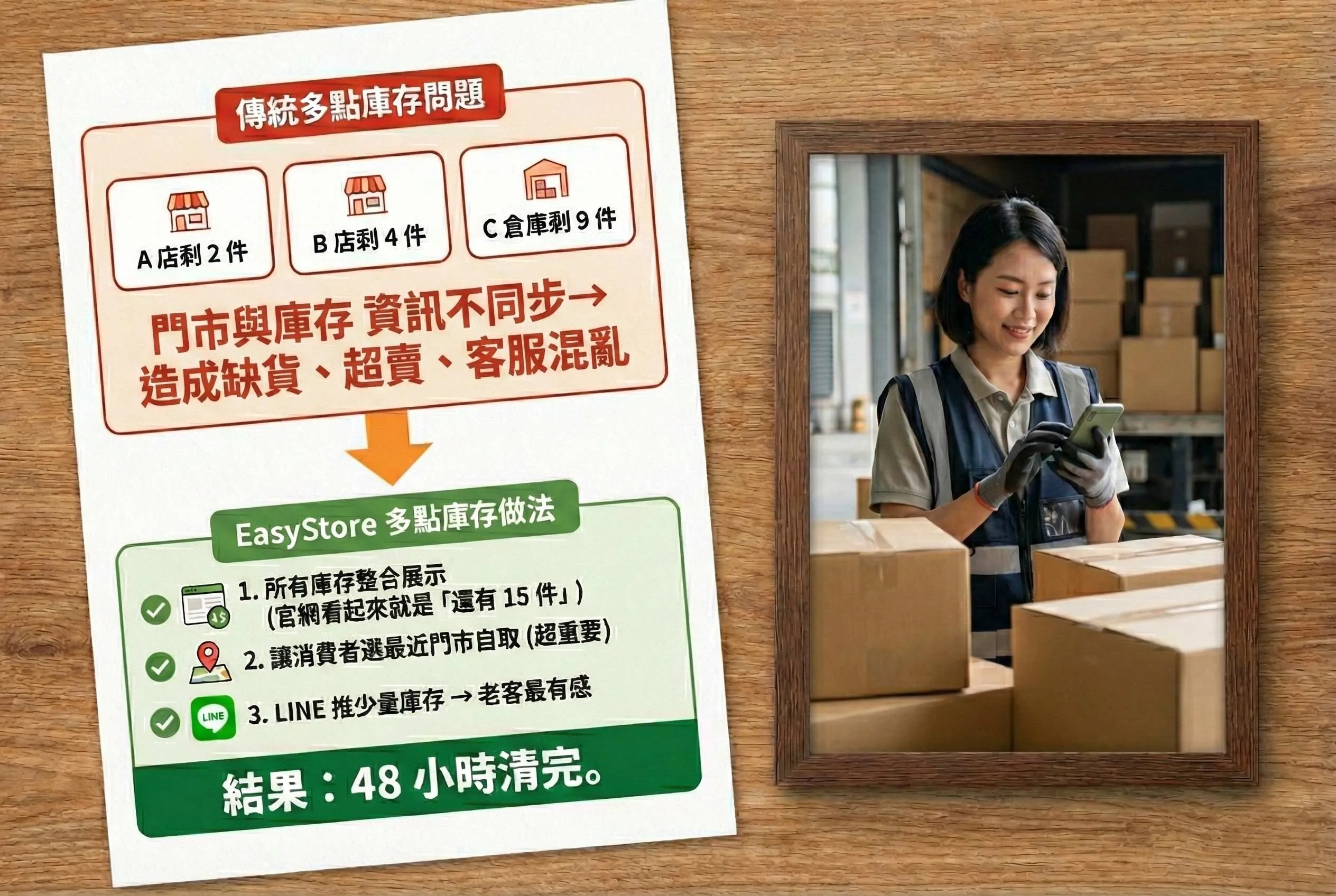 商家成效: 最後 15 件原本清不掉的小量庫存 → 加上多點庫存後 48 小時全數售完。消費者感受: 「每個通路的資訊都清楚、取貨很方便,我知道怎麼買最划算。」