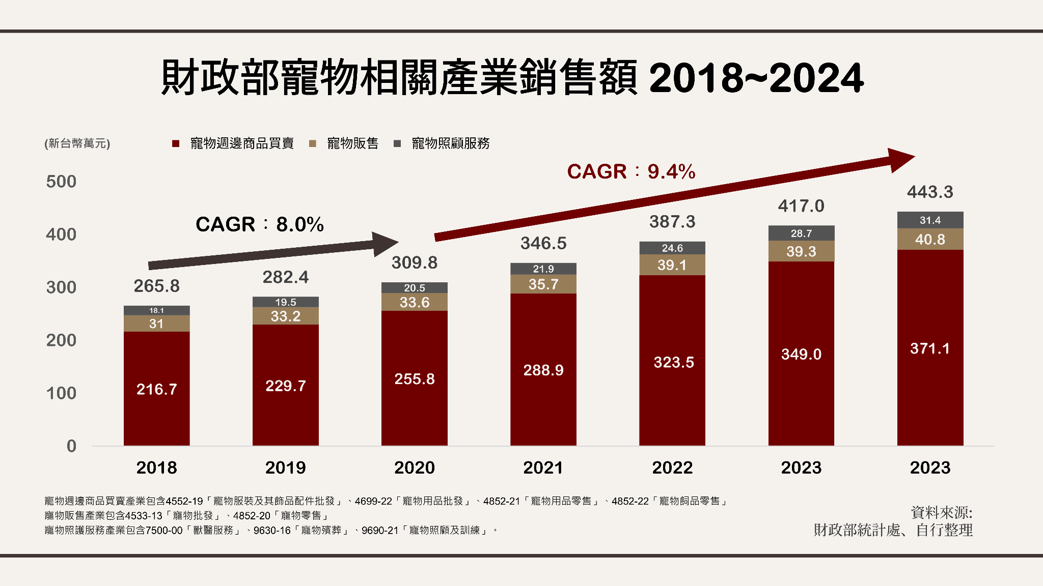 台灣的寵物市場正處於快速成長的階段,隨著寵物登記數持續攀升,對相關商品與服務的需求也同步提升。根據財政部的銷售額統計,台灣寵物產業在疫情後迎來了爆發式增長,從2020年的309.8億元銷售額,迅速攀升至2024年預計的443.3億元,成長幅度達43.1%,年複合成長率更是達到9.4%,遠高於2018至2020年的增速。此外,根據台灣經濟研究院(TIER)的2023年預估,當年台灣寵物產業規模已達631億元,其中寵物食品的銷售額最高,達到308億元,約佔整體產值的一半。