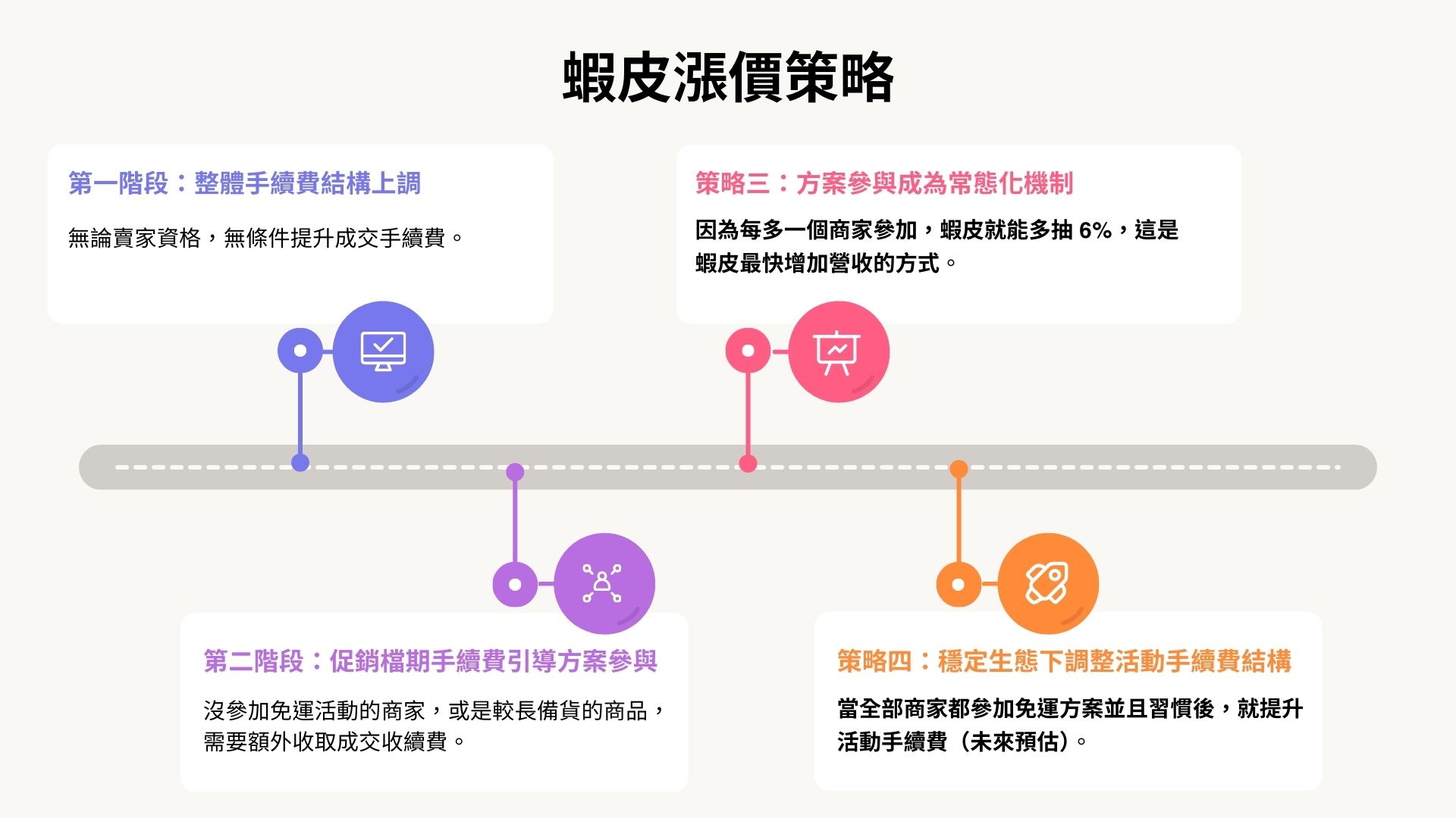 至 2024 年,蝦皮已不再採取全面性調漲成交手續費的方式,而是透過間接的方式調整。在目前留下的多數商家已能承擔現行手續費的前提下,平台進一步測試市場對「全面參與免運補貼方案」的接受度,以評估後續手續費策略的調整空間。